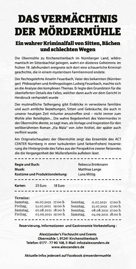 Am 10.07.2021 findet die Premiere des neuen Open-Air-Musicals „Das Vermächtnis der Mördermühle“ in der Obermühle in Kirchensittenbach / Nürnberger Land statt.