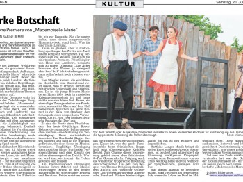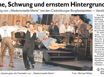 Am 18. Juni war die Uraufführung des neuen Musicals von Matthias Lange (Musik) und Fritz Stiegler (Text). „Mademoiselle Marie“ wurde von den Cadolzburger Burgfestspielen mit einer unglaublichen Energie und Spielfreude in der Hohenzollernburg in Cadolzburg präsentiert. Die hervorragenden Sänger und Schauspieler, das Tanzensemble und die Kinderdarsteller bezauberten das Premierenpublikum.
